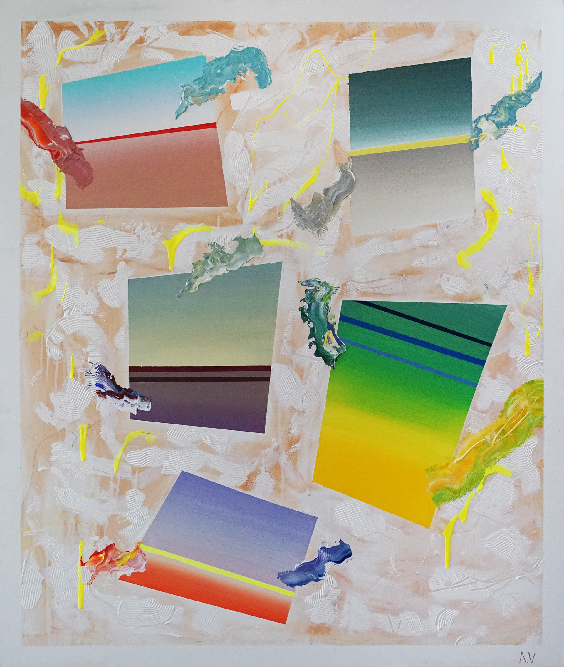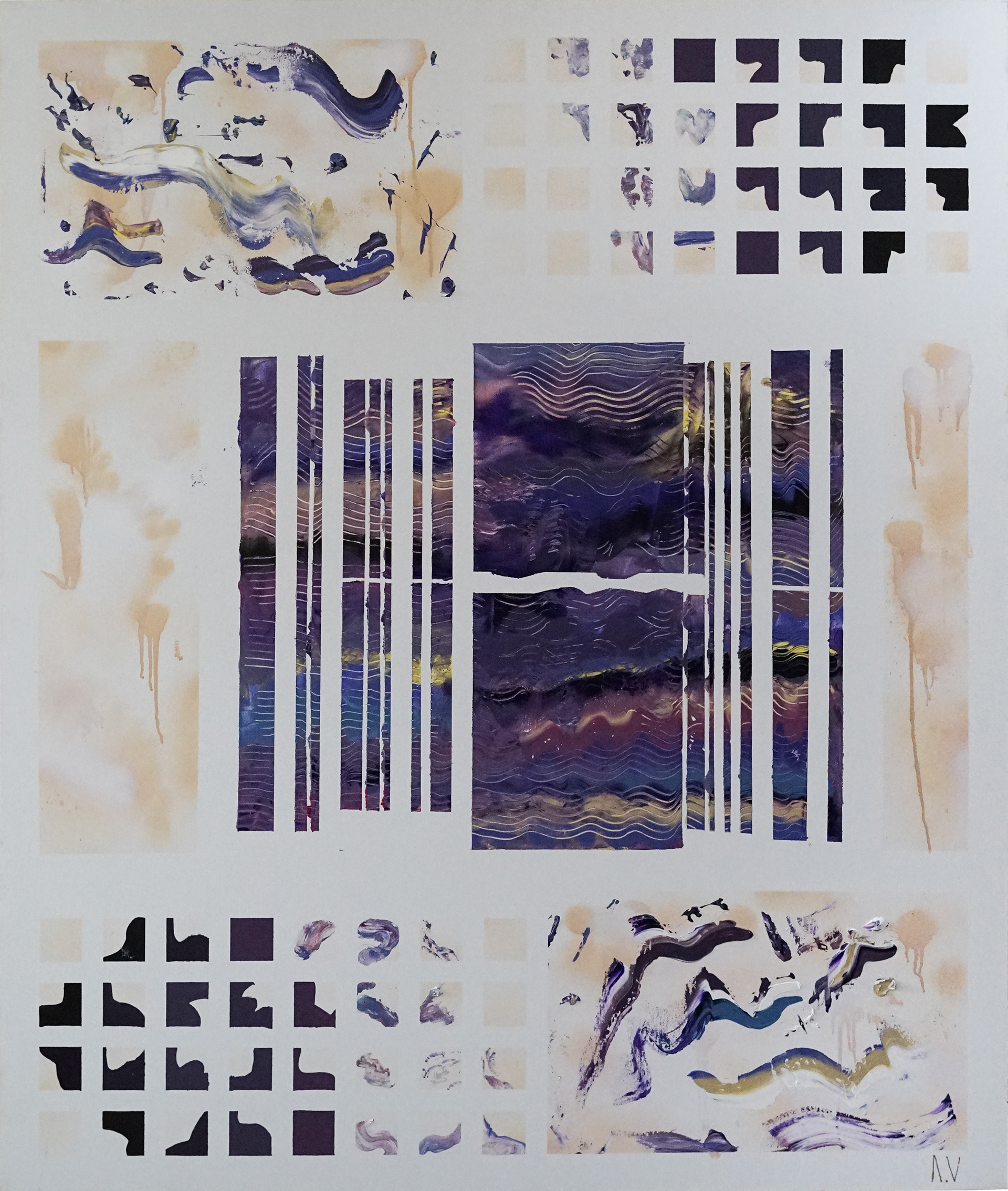 Five fields of color recall five skies at different moments of the day. Soft sandy tones and subtle white textures suggest the presence of the shore. The painting reflects on memory as something layered and fluid—held between light, time, and quiet movement