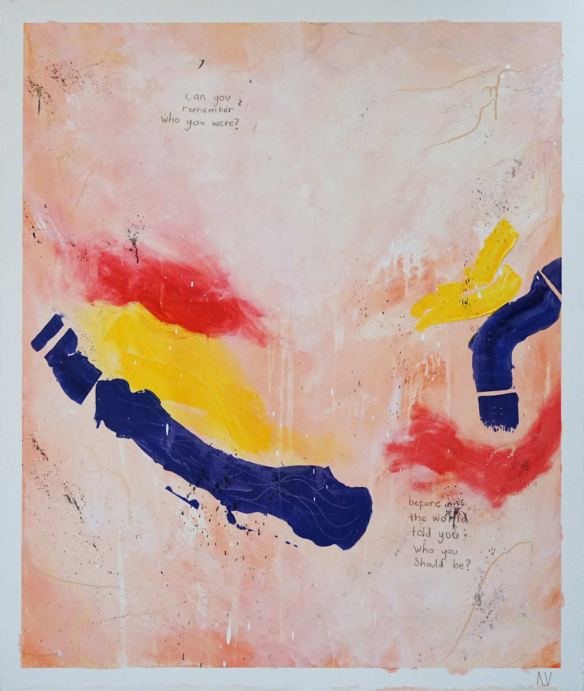 A rose-tinted field holds gentle traces of primary color, recalling play, curiosity, and early feeling. Beneath the softness lies a quiet invitation: Can you remember who you were, before the world told you who you should be? The work reflects on innocence not as something lost, but as something waiting to be recognized again.