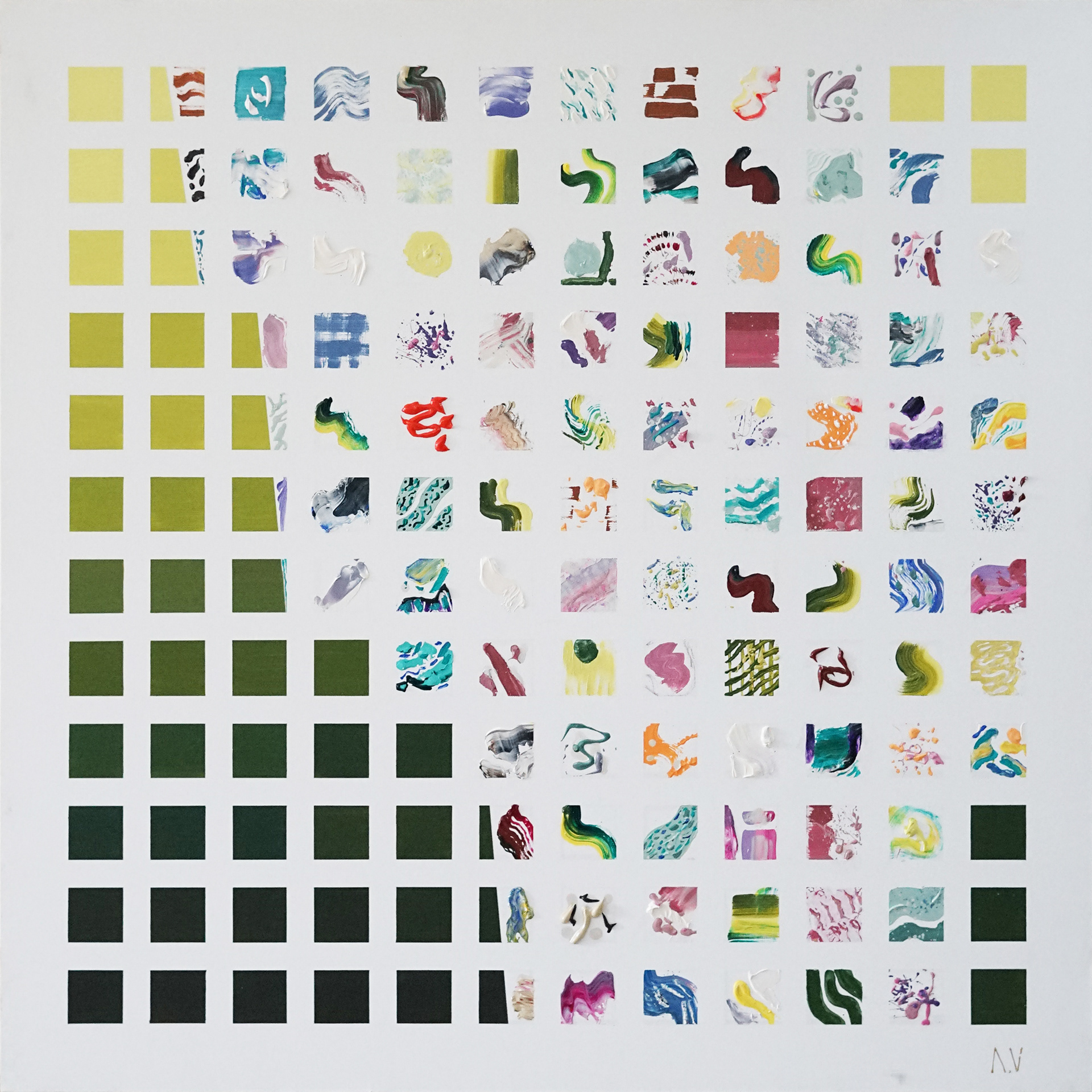 A visually striking painting that melds the beauty of nature with human emotions. It features a vibrant array of interlocking green boxes, resembling a forest ambience, and uses varying shades of green to represent a spectrum of feelings. The composition symbolizes the dynamic nature of emotions, with densely packed and spaced boxes. This artwork underscores the interconnectedness of nature and human emotions, inviting viewers to